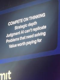 - Alles wat AI maakt, bestond al ergens. Dus komt er geen nieuwe visie uit. Daarom: compete on thinking. Daar zit de échte waarde.